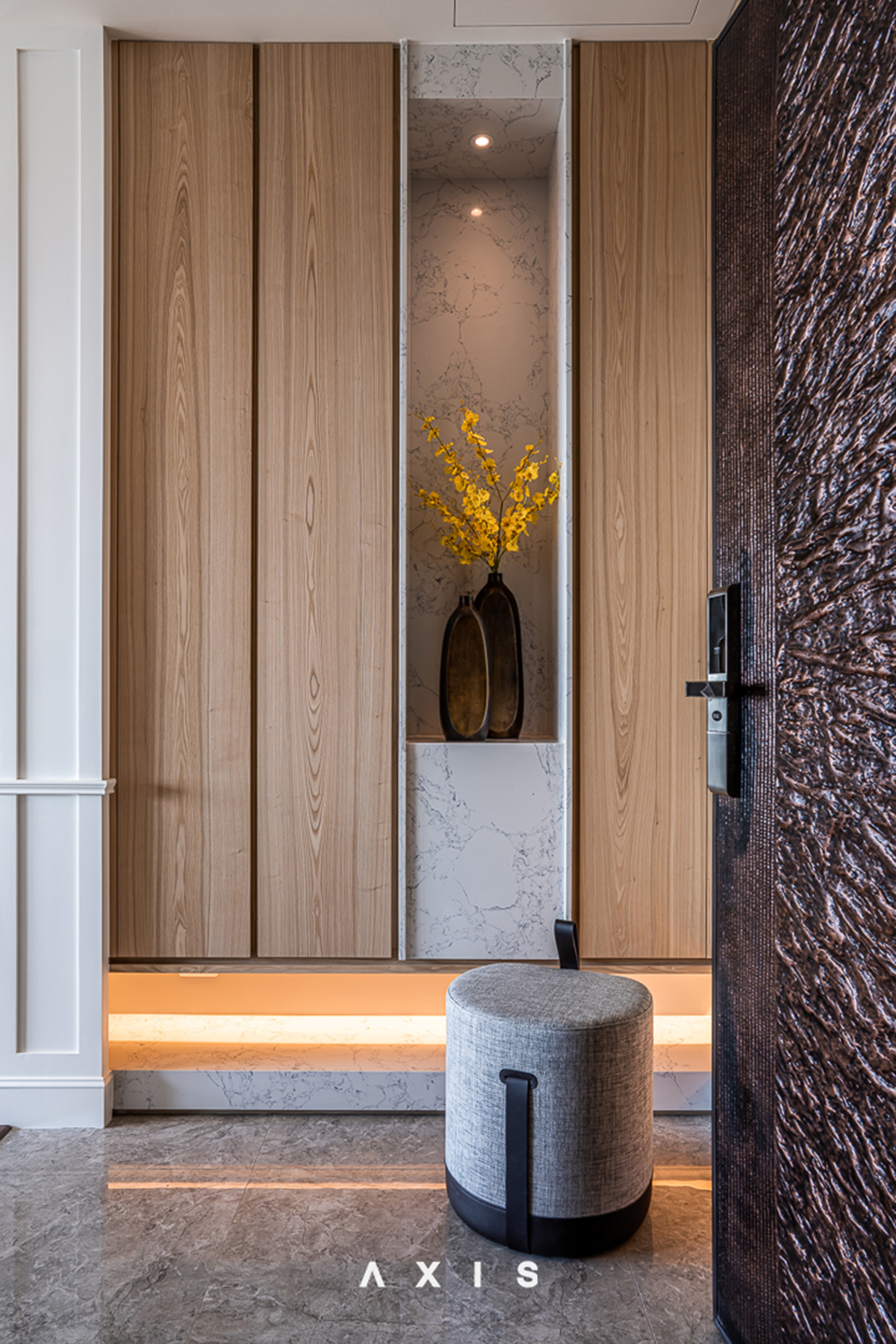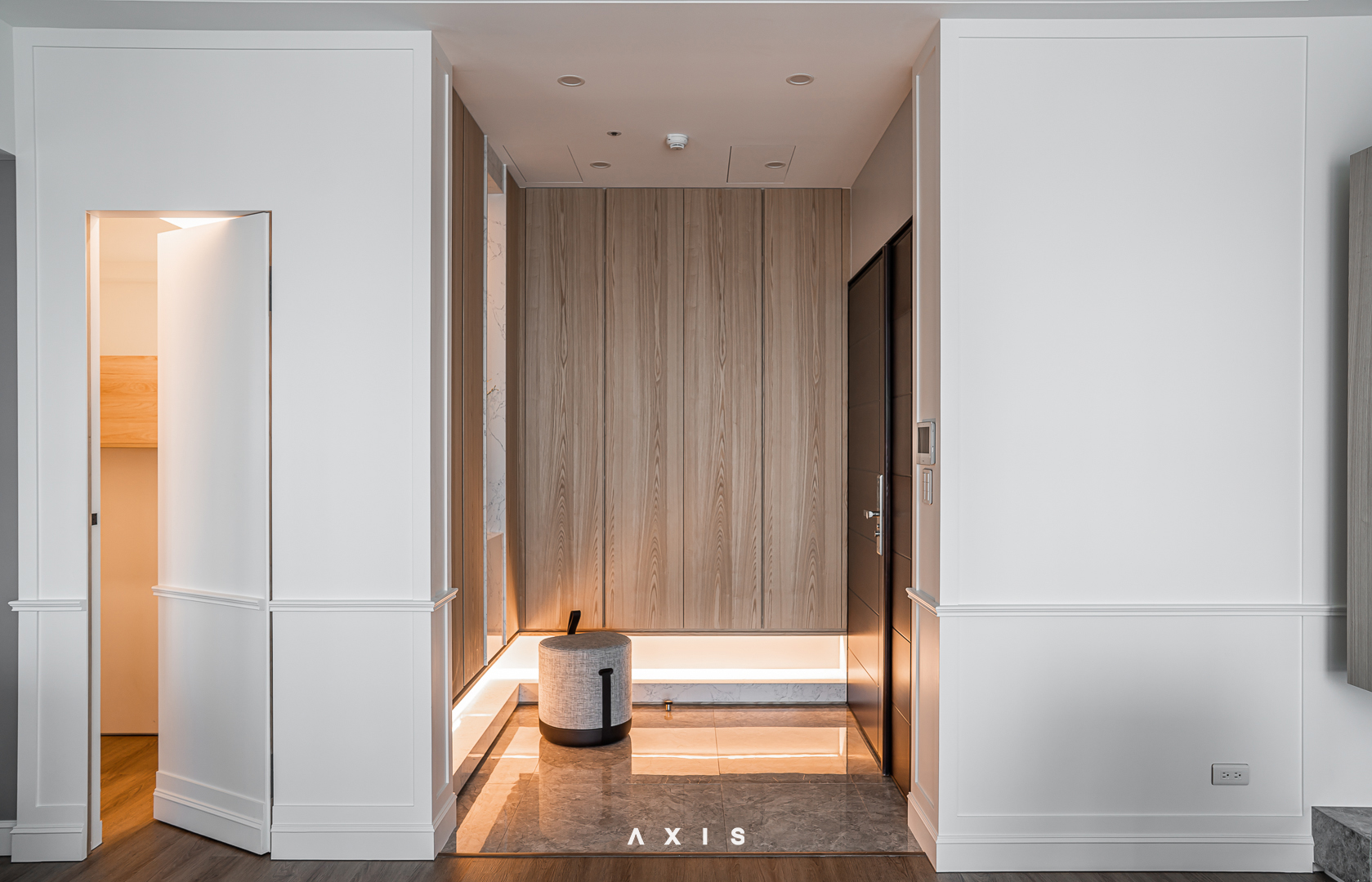 從大門口處進入,極簡設計的玄關乾淨俐落,懸空式的櫃體在視覺上減少了許多壓迫感,並在玄關櫃下方增設照明設備,打亮了入口區。