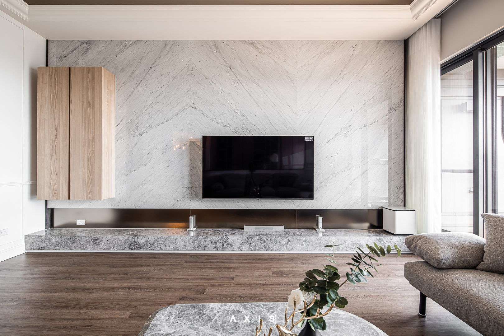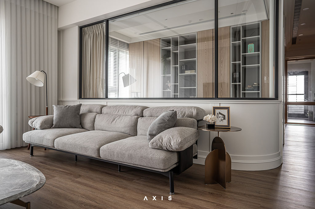 電視櫃呼應沙發後方的玻璃書房,客廳展現出大器淡雅的空間,宛如圖書館般的純淨。
