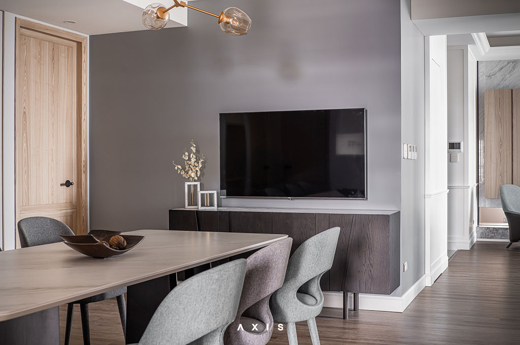 此住宅空間規劃案為超高樓層形態建築,整棟樓層36樓、高度133米。內部格局將客、餐廳空間分離,5米6的客廳面寬延伸至前陽台,形成極佳的視覺空間感,客廳牆面再擺上大尺寸液晶電視,盡情享受視覺震撼力。