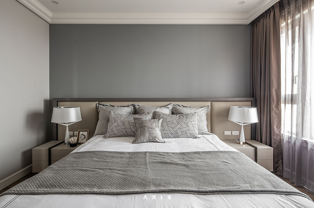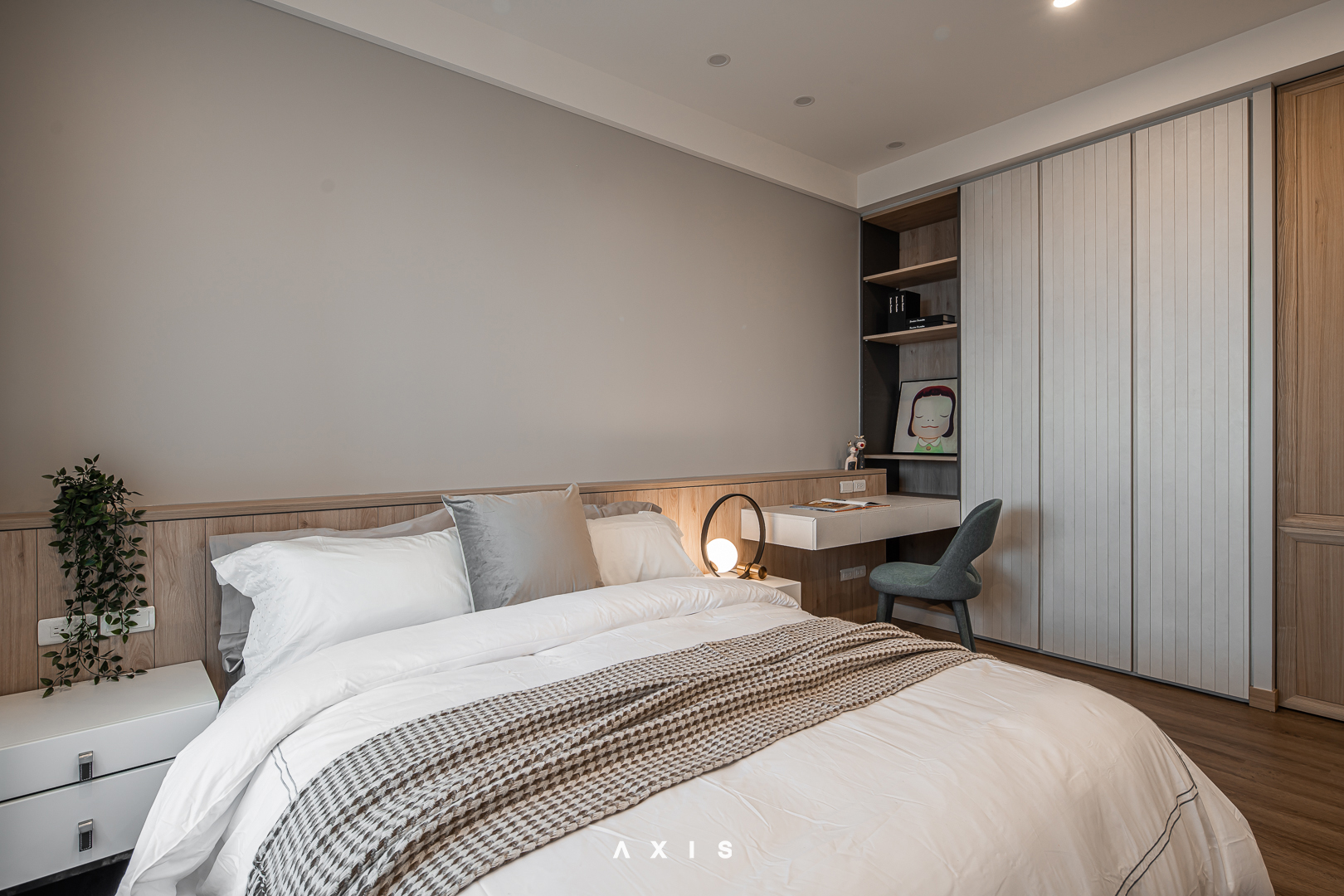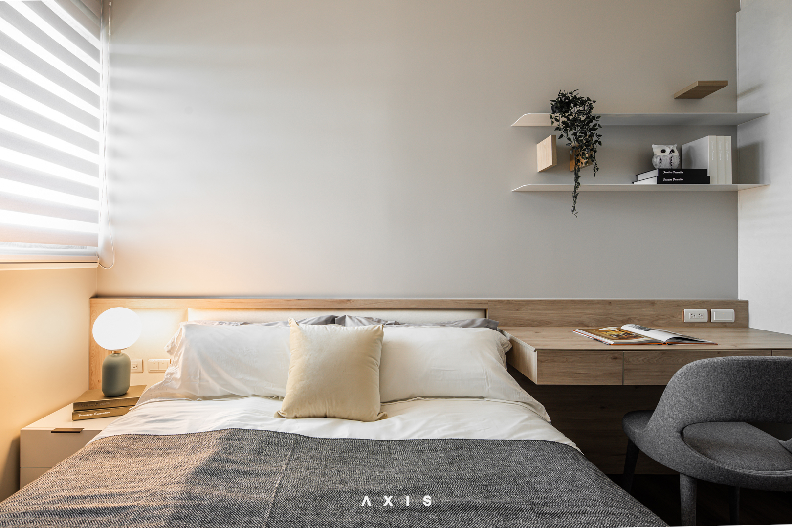 沿光進入私人領域部分,主臥以同色系做深淺配色展現獨具個性,除展現現代時尚風範外,也給人一種高雅的感受。