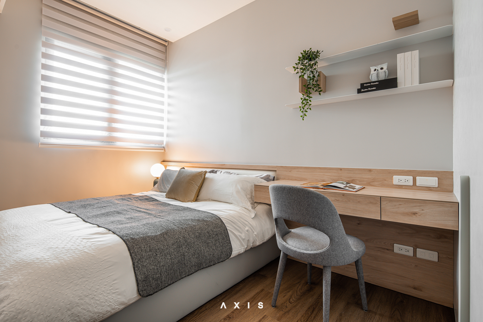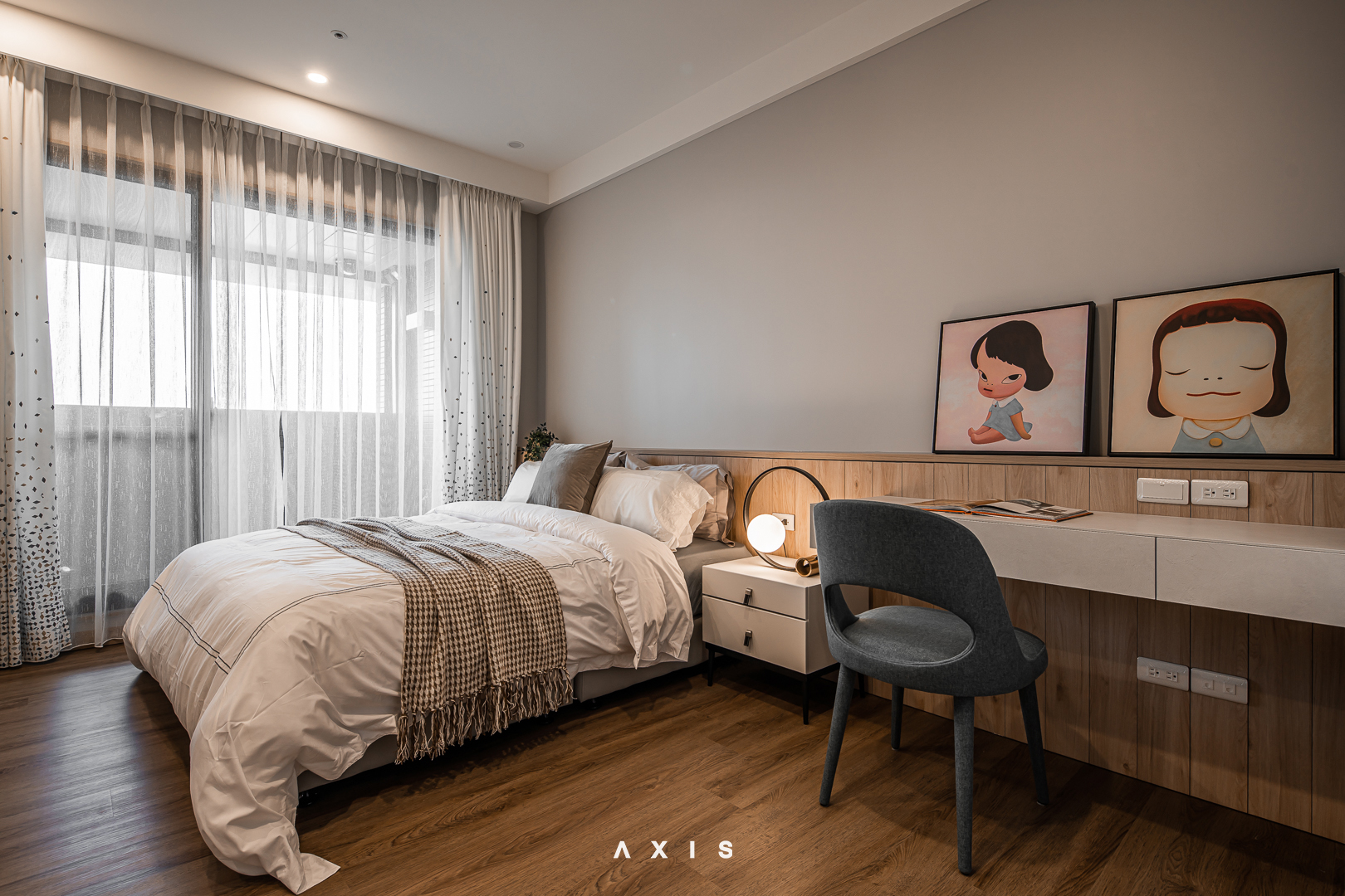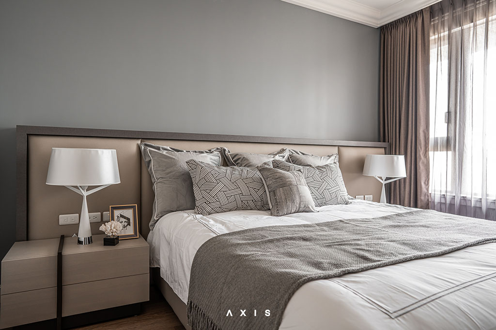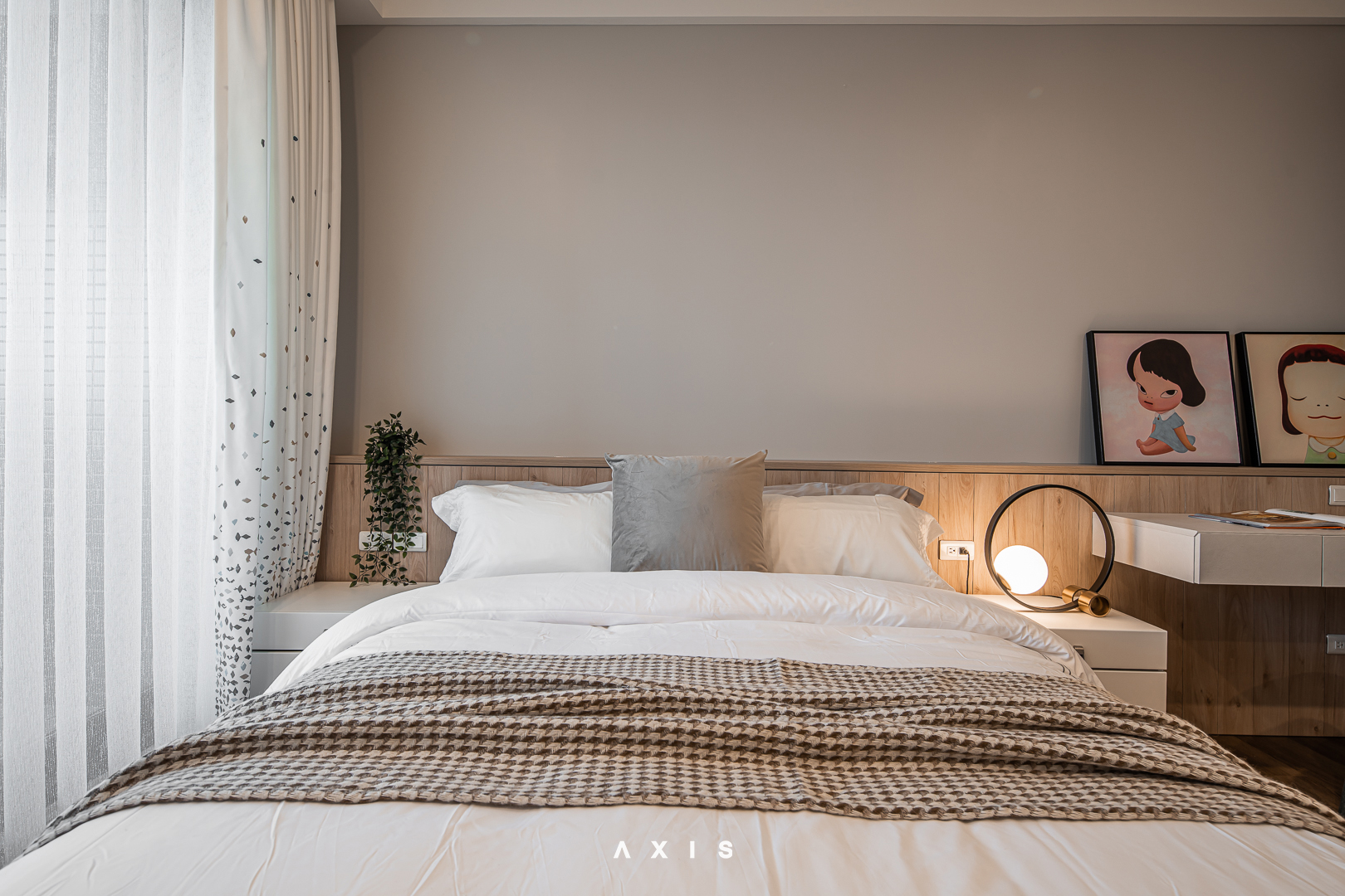 沿光進入私人領域部分,主臥以同色系做深淺配色展現獨具個性,除展現現代時尚風範外,也給人一種高雅的感受。