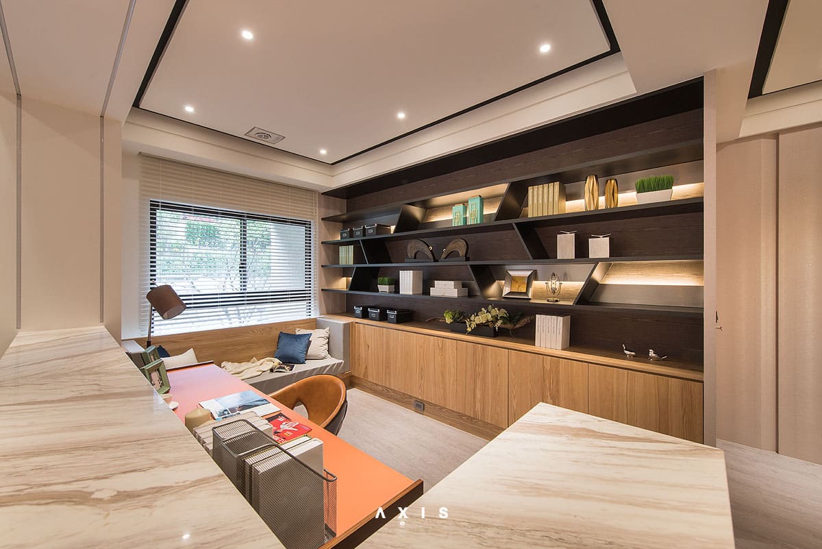 狹長的空間中在不受到動線影響下,運用了空間特性,規劃成一體成形的長桌與機能性書櫃,讓整體空間流暢又不失功能性。