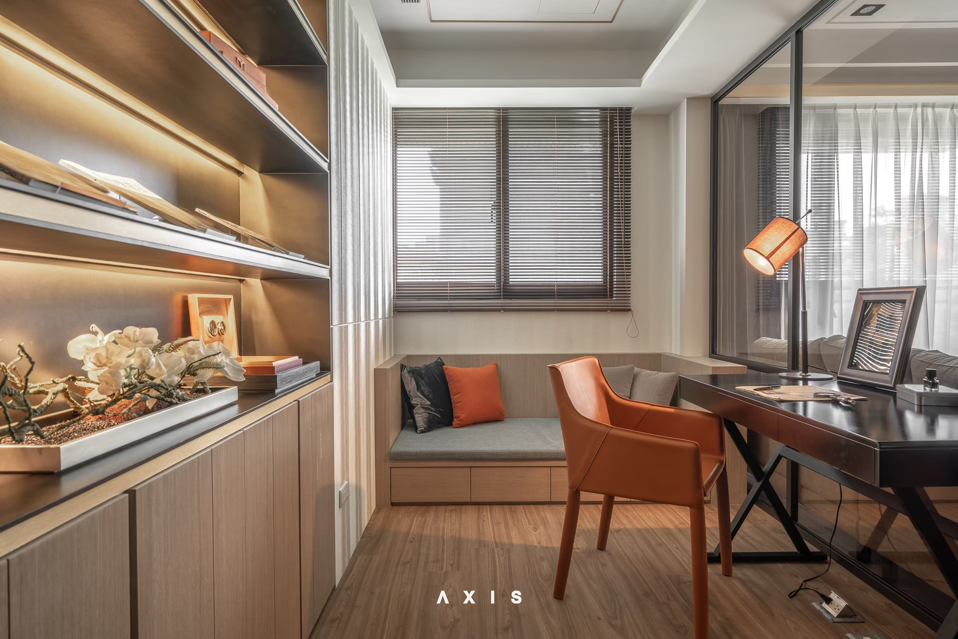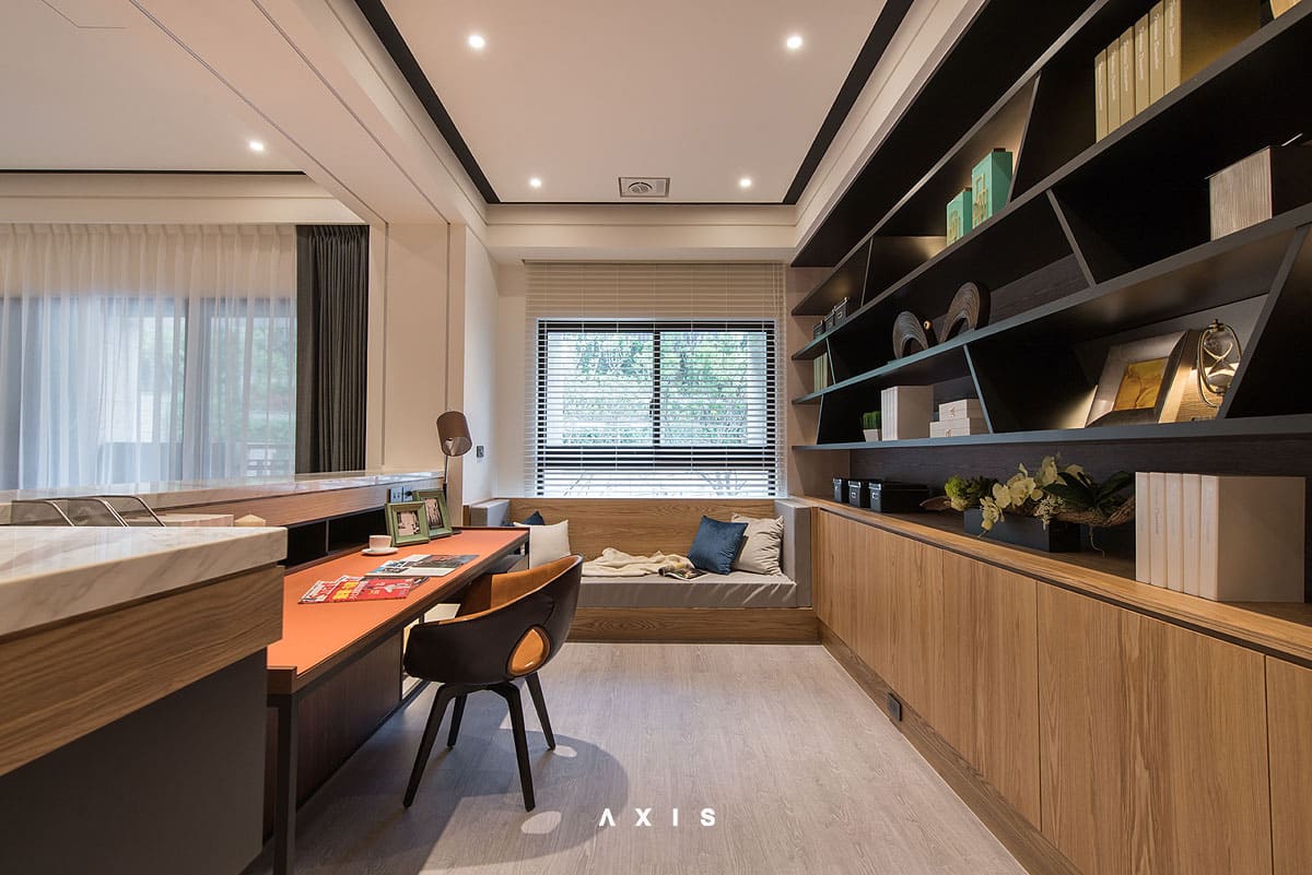 結合了書房與起居室的空間,在靠窗處設置了一個可以發呆、休息的寬敞臥榻,讓書房的使用自由度提高。除了提供周末午後休閒時光的功能外,亦可以隨時變身為臨時客房,讓親朋好友來時當作客房用。