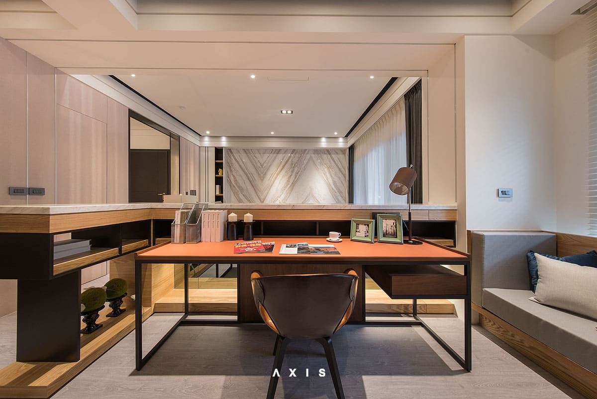 回到家就是要與家人溝通互動、聯繫情感,這樣開放式的設計,除了在書房工作時可以無隔閡地與家人互動外,也特別適合客廳空間不大的格局,因此也成為近幾年最受歡迎的書房型態之一。開放式的書房延續了客廳的空間感,只要利用沙發搭配矮牆即可定位出書房格局,同時書桌後方的展示書牆也挺適合作為沙發背景牆,讓客廳視野更開闊寬敞。