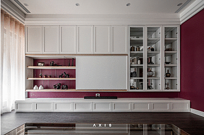 客廳的電視牆很特別,就像是一面超大的相框,展示滿滿的收藏品。因為男主人愛看電視、女主人愛看書,設計師特別設計一面拉門,將電視隱藏起來,同時呼應了家中每個房門都是拉門的一致性。