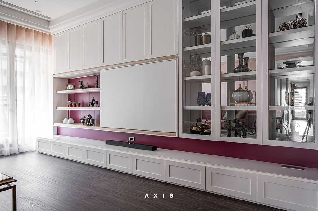 電視櫃的拉門收納,再搭配上一旁櫃體內部的鏡面設計,讓整體空間在視覺上更為明亮寬敞。
