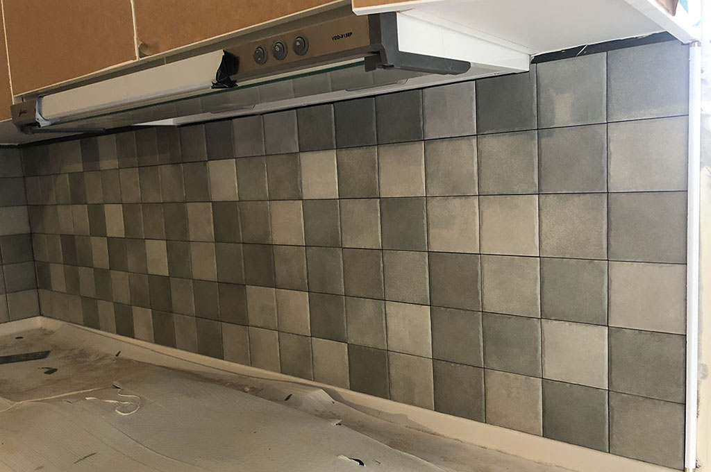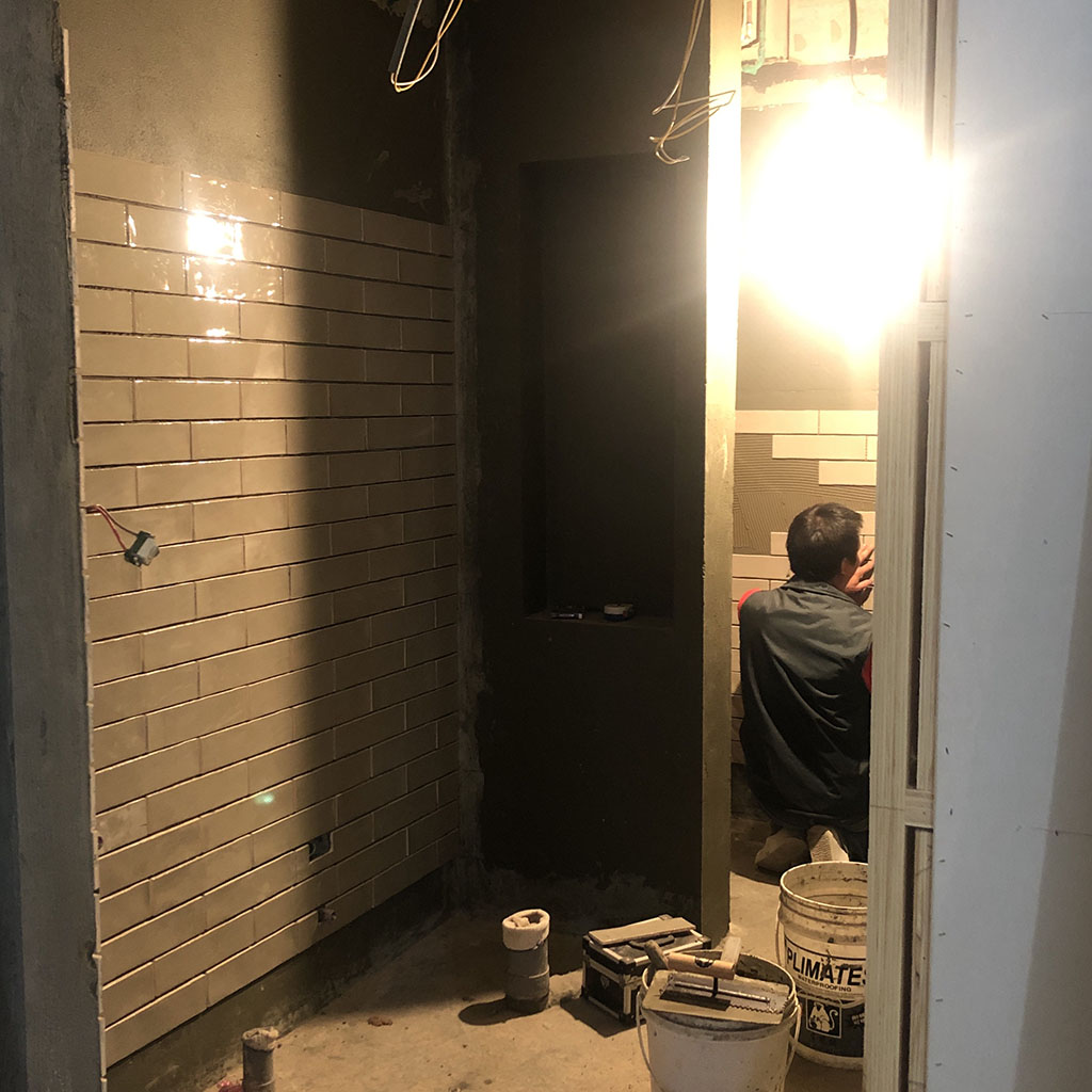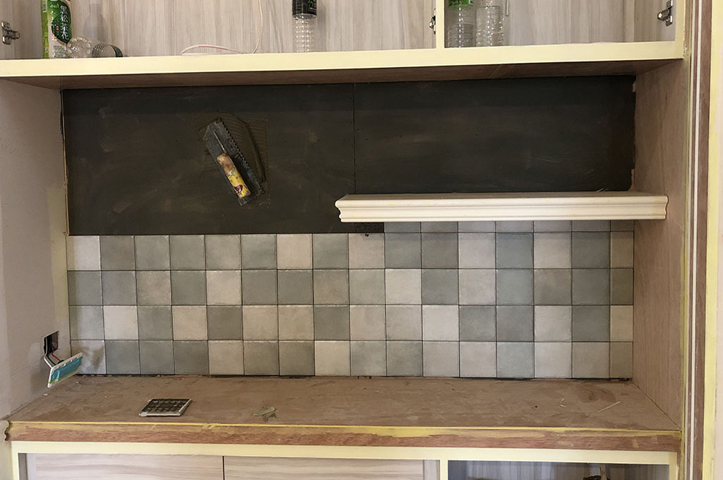 左圖為浴室磁磚鋪貼時的過程照,牆壁上的每一片磁磚都是師傅一片片慢慢貼合上去,需要極度的細心與耐心才能完成。右圖為磁磚鋪貼完成照,縫隙已經填補起來,更加好看。