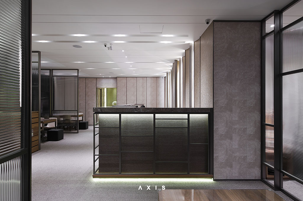 透過天然紋路鮮明的材質表現藝術感,櫃台後方利用塊面錯置與燈光佈局展現立體大器,充滿國際性視野的恢弘格局。